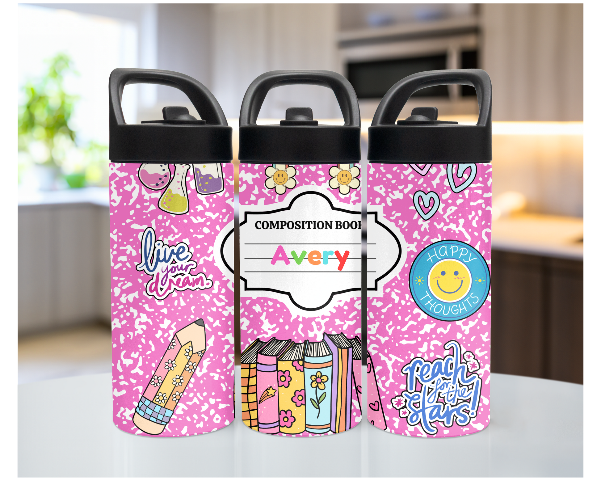 Upgrade your child's hydration game with our 16oz Personalized Kids Water bottle in a fun Composition Book design. With its insulated design, their drink will stay cool for hours. Plus, its easy hand wash only feature makes it a breeze to clean. Keep them hydrated and happy on-the-go!